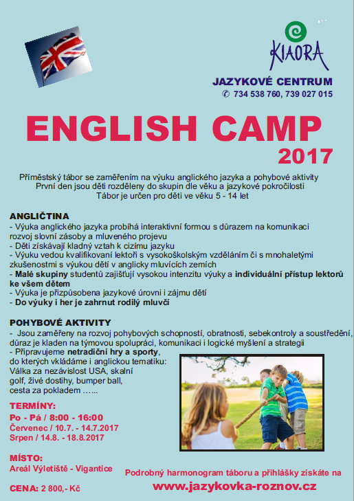 Pořádá Příměstský tábor zaměřený na výuku anglického jazyka a pohybové aktivity pro děti ve věku 5 - 14 let.