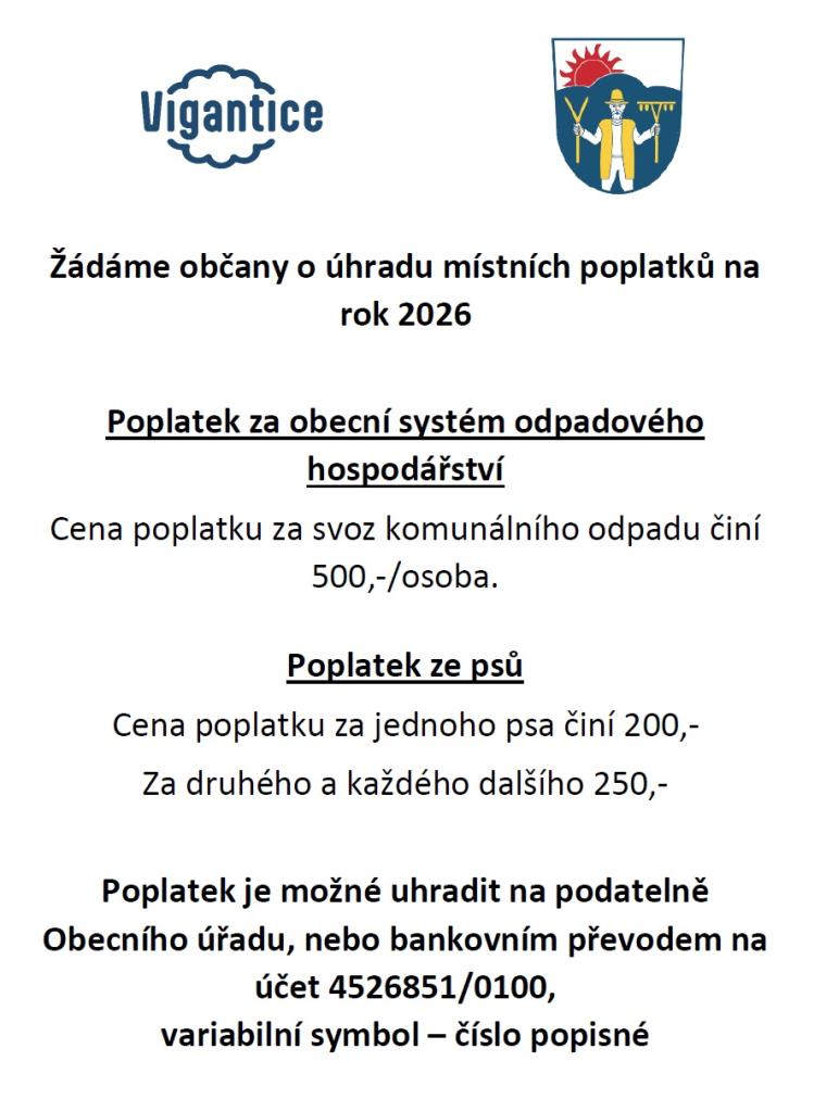 Obecní úřad vyzývá všechny občany k úhradě místních poplatků na rok 2026. Poplatek za obecní systém odpadového hospodářství činí 500 Kč na osobu. Dále platí poplatek za psy, kde cena za jednoho psa je 200 Kč a za druhého a každého dalšího 250 Kč. Platbu je možné provést buď na podatelně Obecního úřa