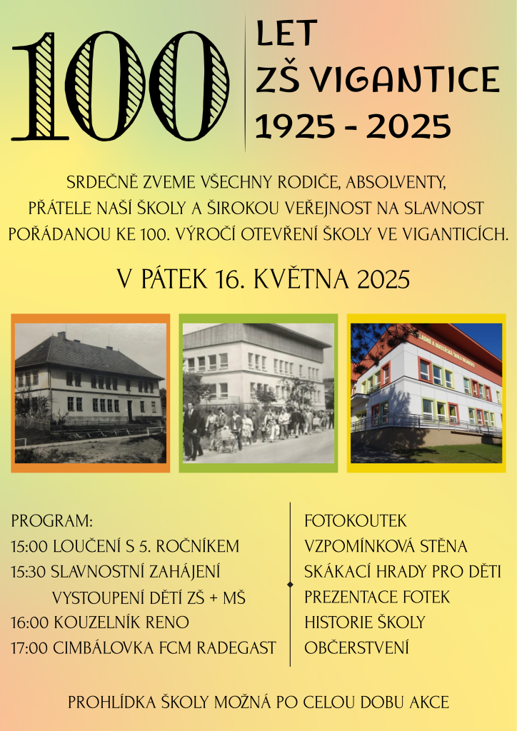Základní škola Vigantice srdečně zve všechny rodiče, absolventy, přátele školy a širokou veřejnost na oslavu ke 100. výročí jejího otevření. Akce se koná v pátek 16. května 2025 a nabídne pestrý program: od loučení s 5. ročníkem, přes vystoupení dětí, až po kouzelníka Rena a cimbálovku FCM Radegast. Nezapomeňte si také užít prohlídku školy a občerstvení po celou dobu trvání akce.
