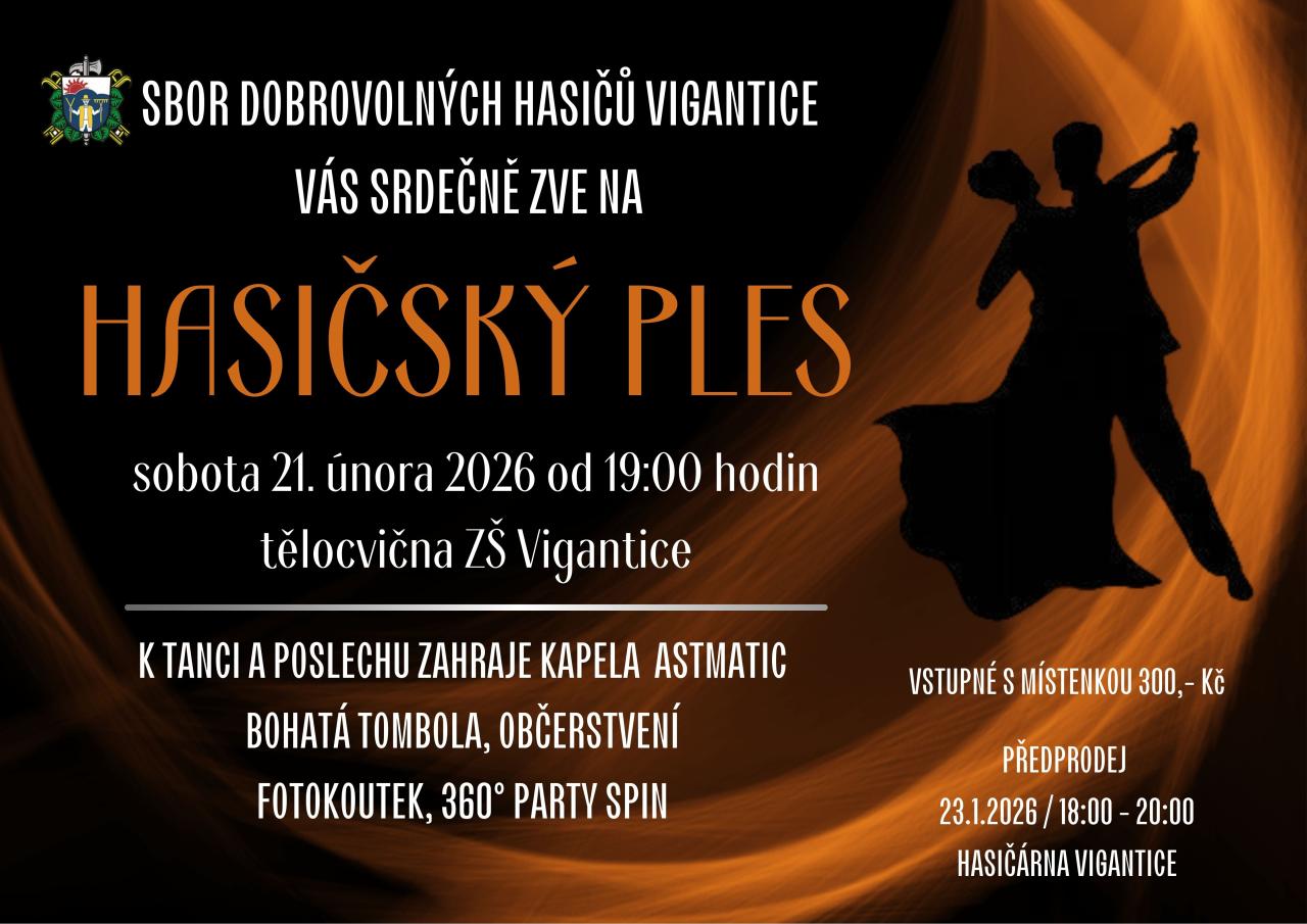 Hasičský ples se uskuteční v sobotu 21. února 2026 od 19:00 hodin v tělocvičně ZŠ Vigantice. Přijďte si zatancovat a poslechnout hudbu, kterou pro vás zahraje kapela. Těšit se můžete na bohatou tombolu a občerstvení.