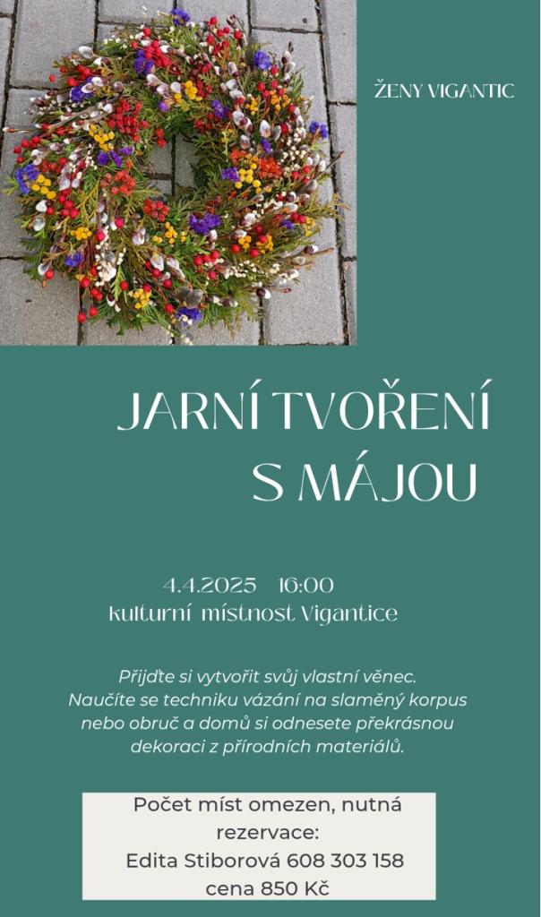 Workshop "Jarní tvoření" se koná 4. dubna 2025 od 16:00 v kulturní místnosti Vigantice. Naučte se vázat věnec na slaměný korpus nebo obruč a odnesete si domů krásnou dekoraci. Cena účasti je 850 Kč, rezervace nutná na telefonním čísle 608 303 158.