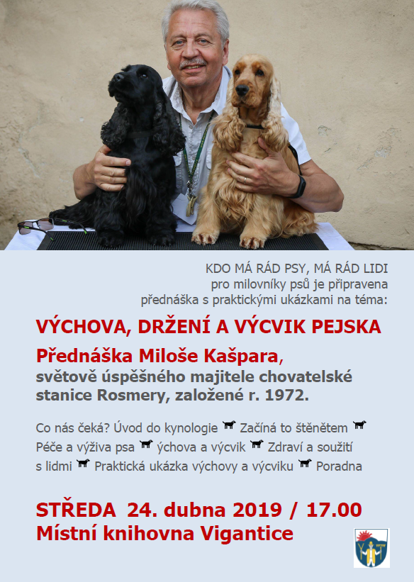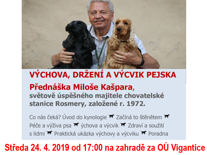 Pro milovníky psů je připravena přednáška s praktickými ukázkami výchova, držení a výcvik pejska. Přednáší Miloš Kašpar- světově úspěšný majitel chovatelské stanice Rosmery, založené roku 1972.