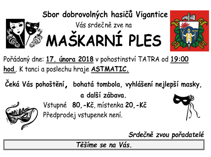 SDH Vigantice Vás zve na MAŠKARNÍ PLES pro dospělé 17. února 2018 od 19:00 hodin v pohostinství TATRA ve Viganticích.