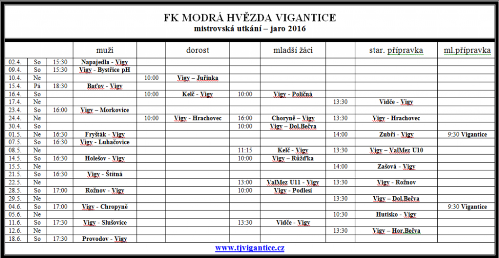 Rozpis utkání FK Vigantice - jaro 2016